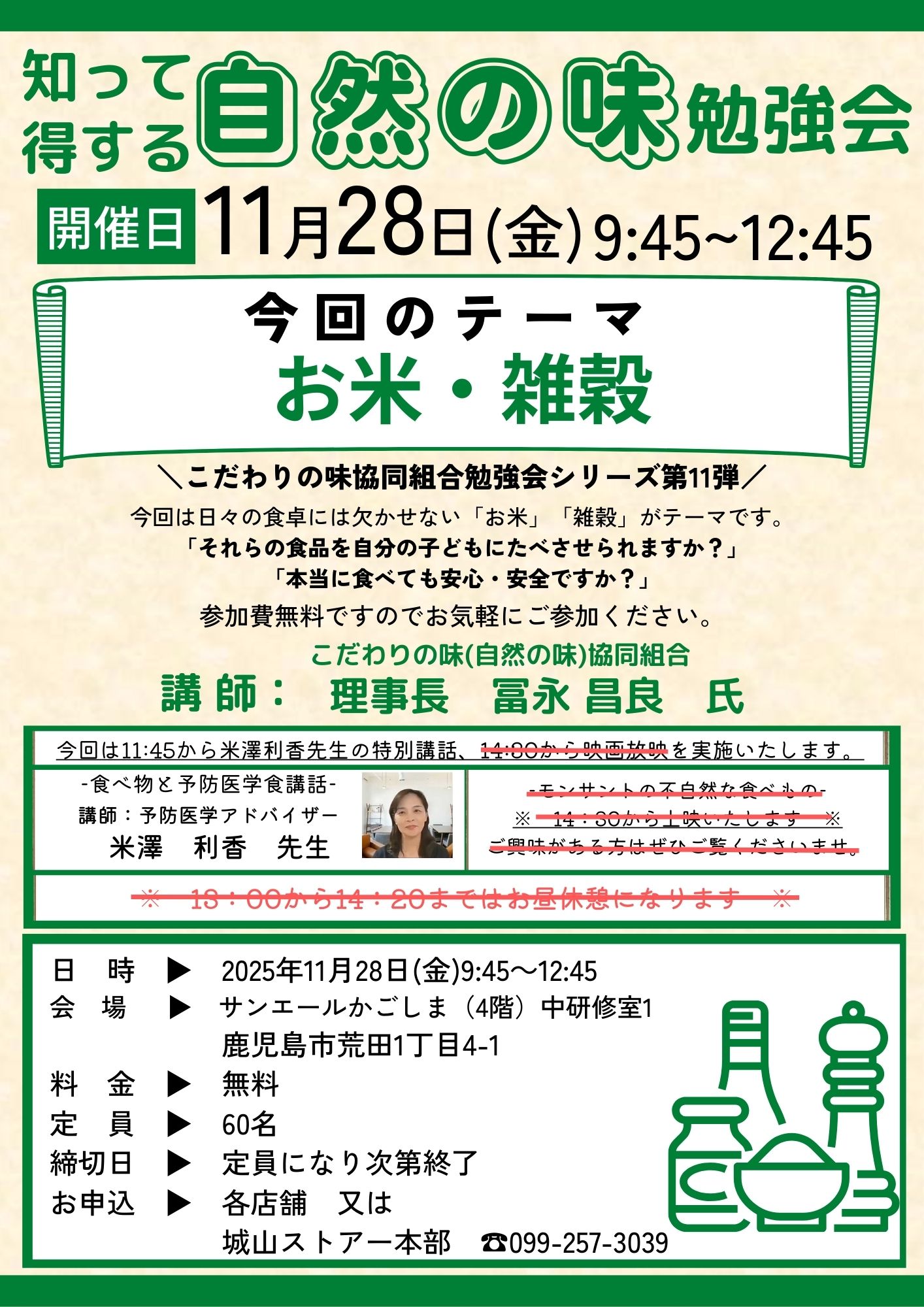 第11回目となる、知って得する~自然の味勉強会~開催のお知らせです(*^-^*)