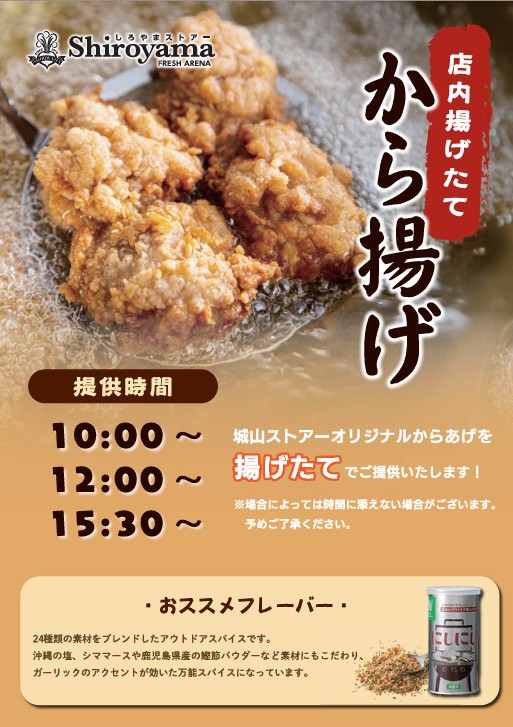城山ストアーバイキングの人気商品「手作り唐揚げ」の出来立て販売の提供時間のご案内いたします🤩