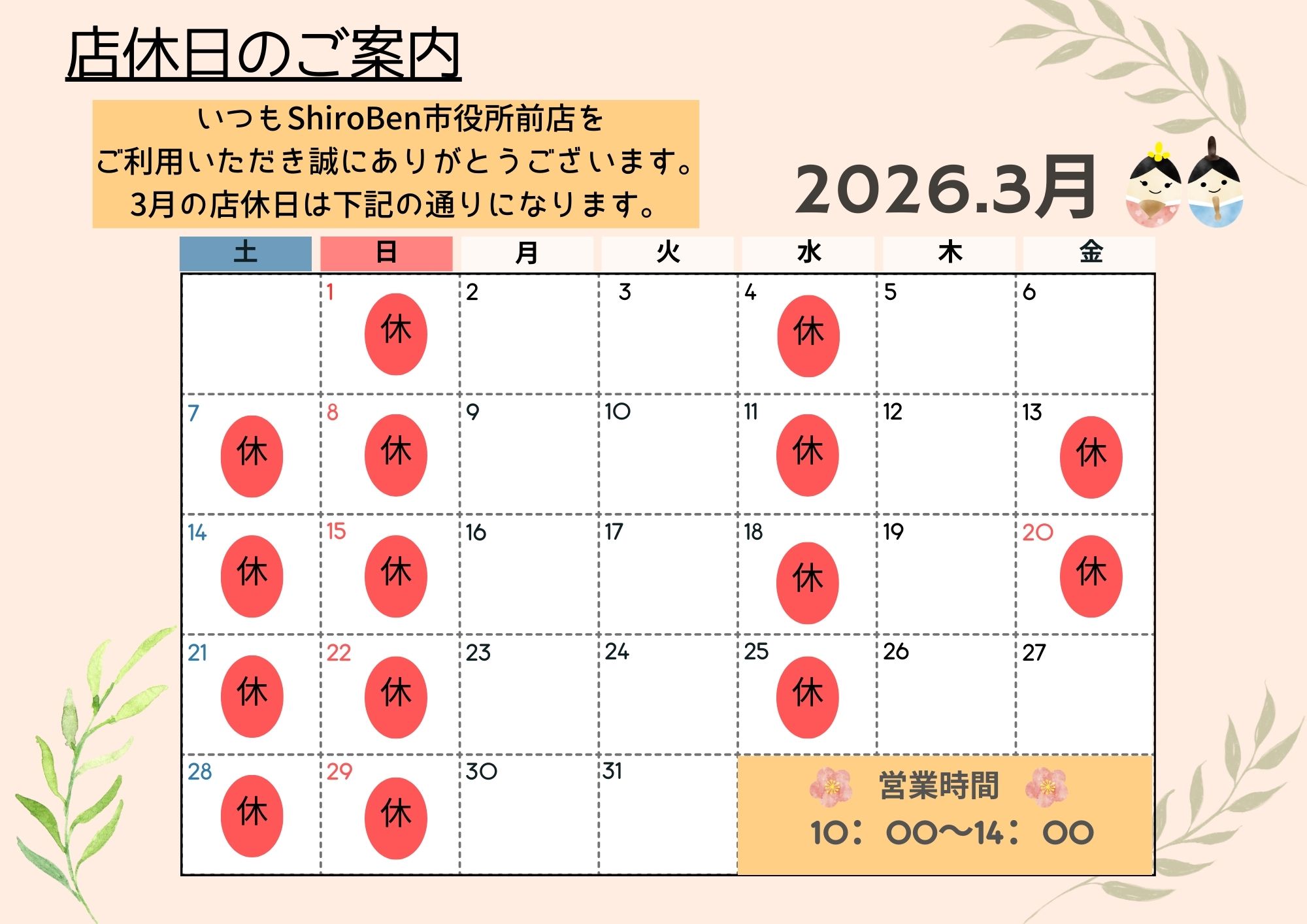 3月のShiroben市役所前店の店休日のご案内になります🙇