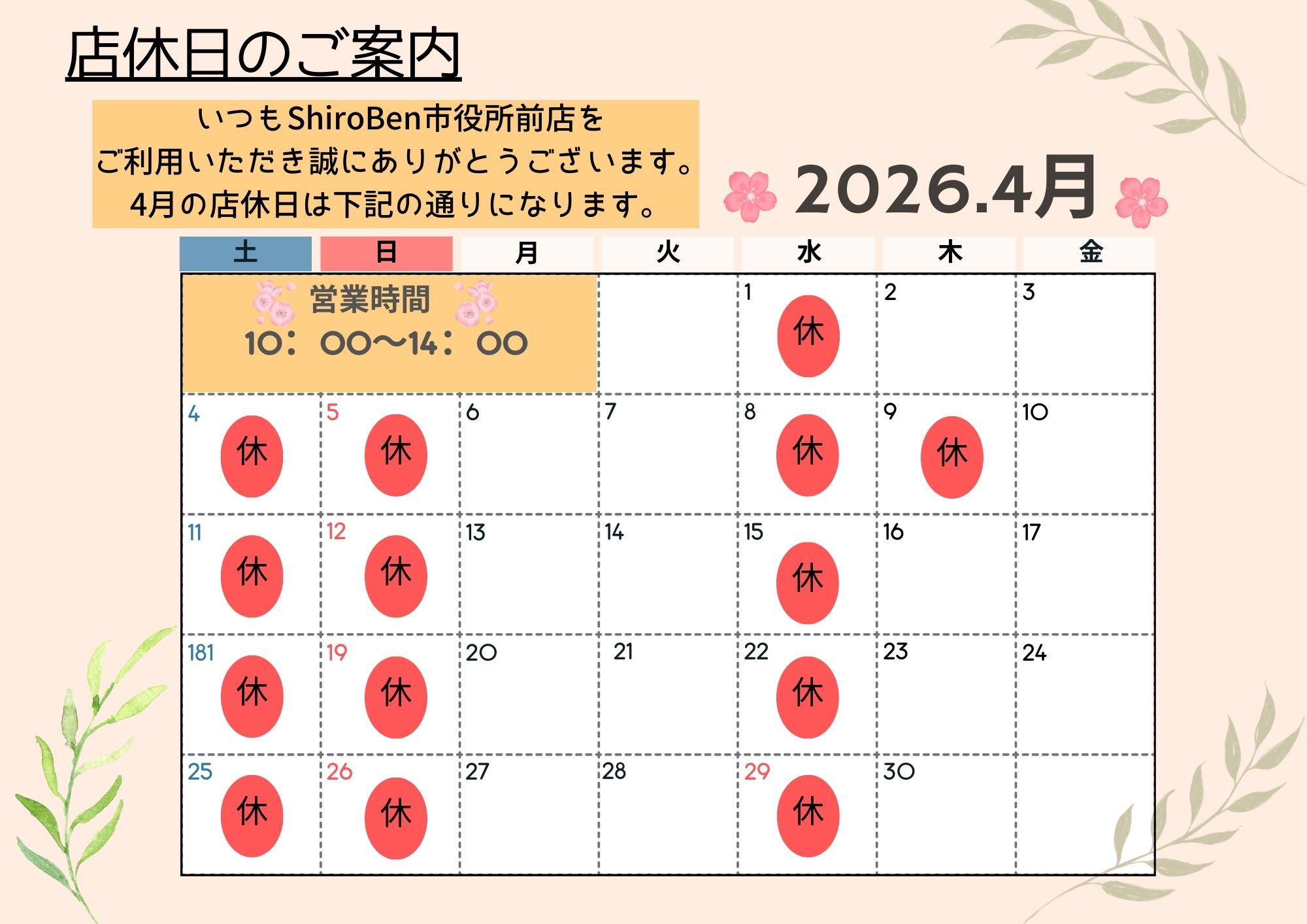 4月のShiroben市役所前店の店休日のご案内になります🙇