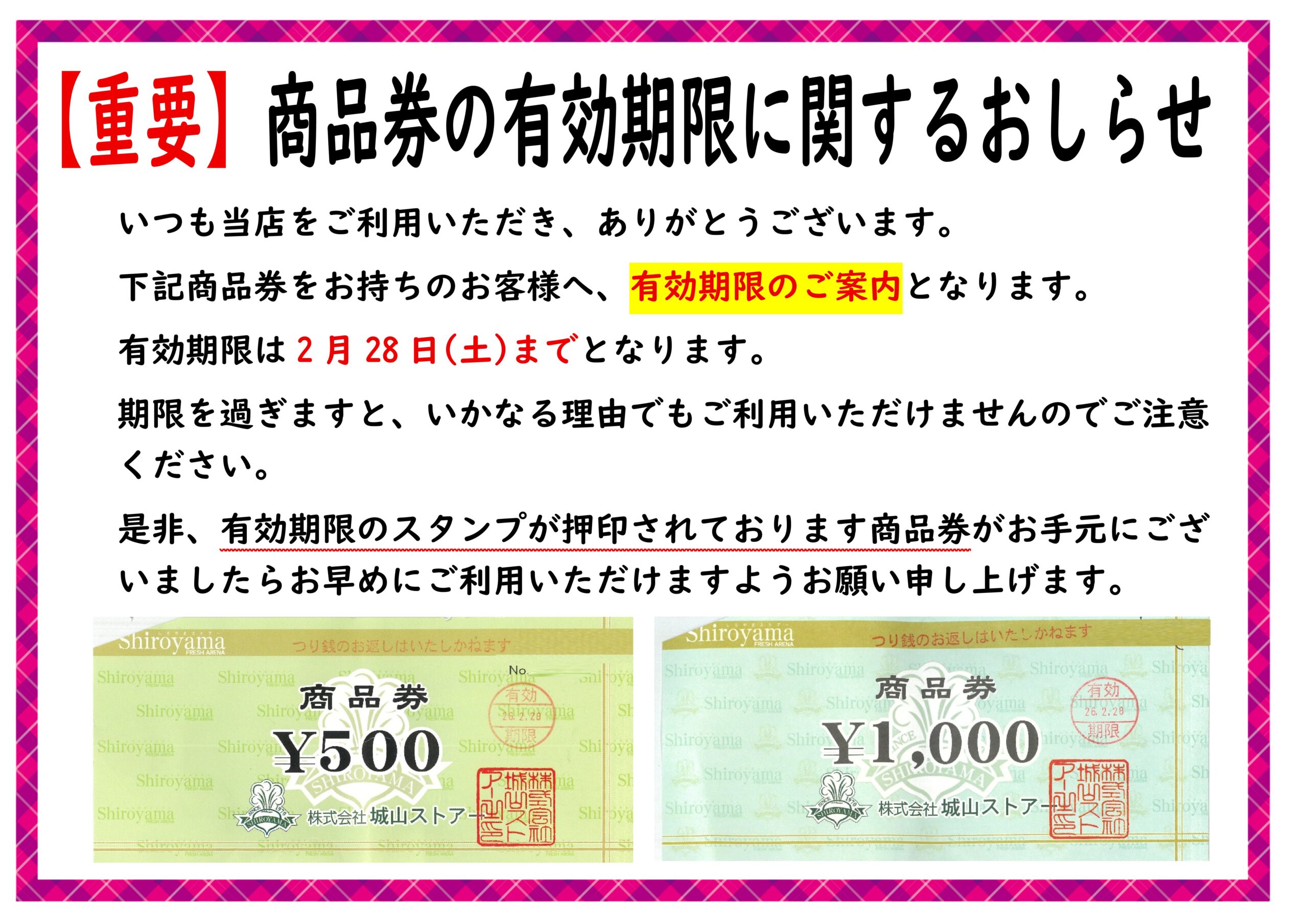 城山ストアー商品券をお持ちのお客様へ、有効期限のご案内です。