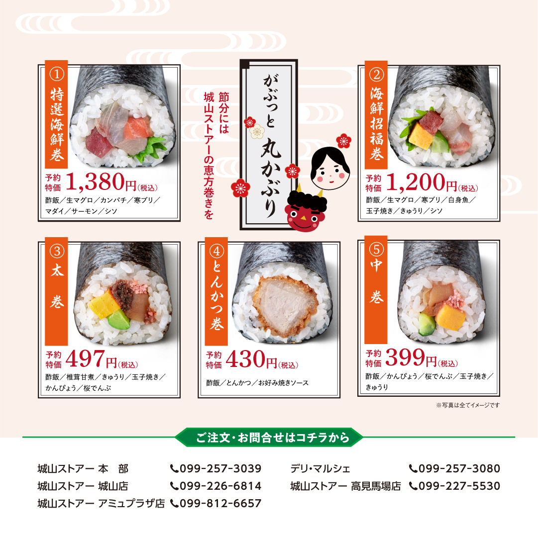 皆さんで「南南東」を向いて城山ストアーの恵方巻を食べましょう♪