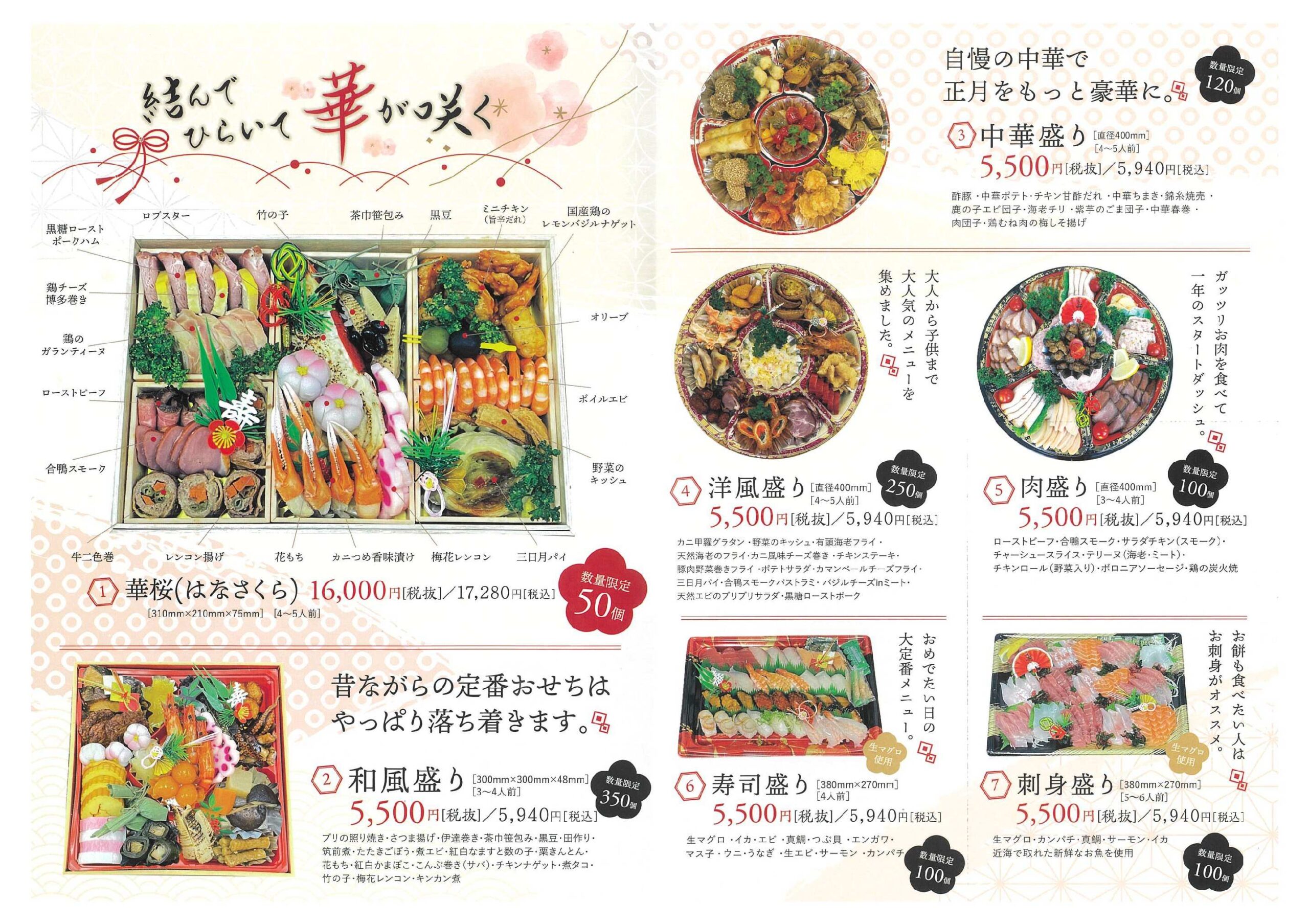 定番のおせちから、肉盛りや寿司盛り、そして一段と華やかな内容の「華桜(はなさくら)」まで、
